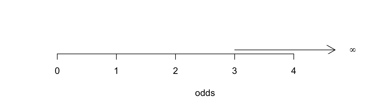 A probability \(p\) is always between 0 and 1. If we transform a probability \(p\) into odds, we always end up with a number somewhere between 0 and infinity. For example if we use a small probability like 0.1, the corresponding odds is \(\frac{0.1}{0.9} \approx 0.11\). If we use a large probability like 0.9, the corresponding odds is \(\frac{0.9}{0.1} \approx 9\).