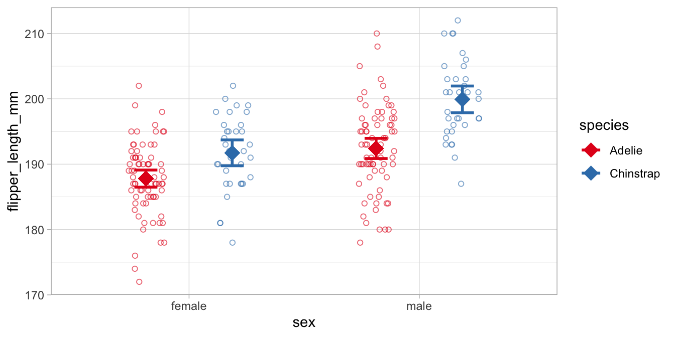 Comparing the Adelie and the Chinstrap data, we see that for both males and females, the Adelie penguins have smaller flippers than the Chinstrap penguins. Comparing males and females, we see that the males have generally larger flippers than females. More interestingly in relation to this chapter, the means in the males are farther apart than the means in the females. Thus, in males the effect of species is larger than in females. This is the interaction effect, and this difference in the difference in means is equal to 3.56 in this data set. With a confidence level of 95% we can say that the moderating effect of sex on the effect of species is probably somewhere between 0.06 and 7.06 mm in the population of all penguins.