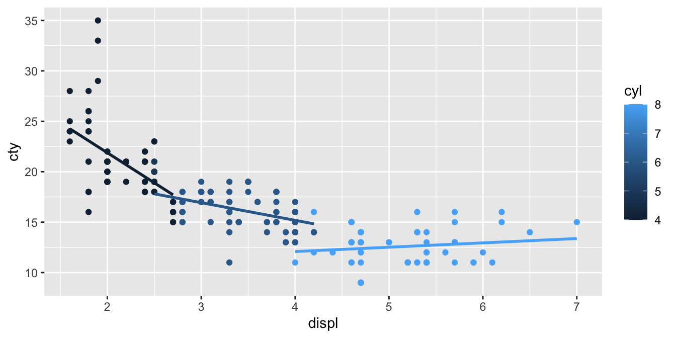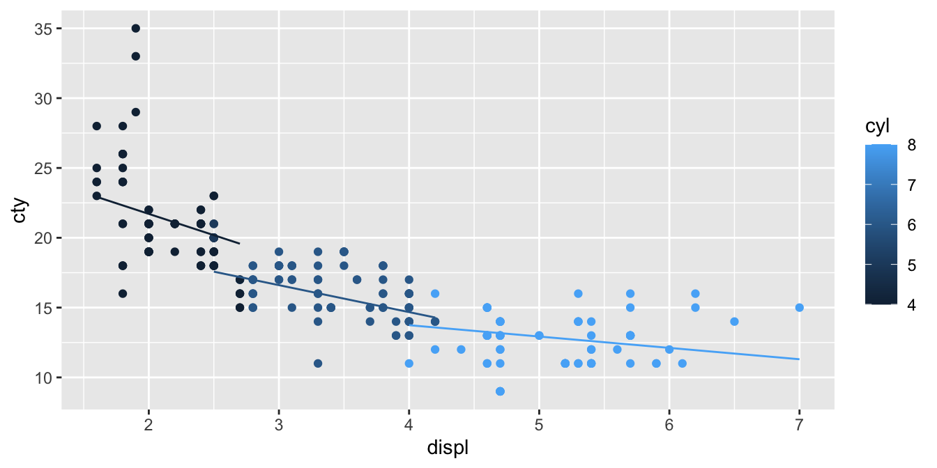ggplot(aes(x = displ, y = cty, colour = cyl, group = cyl)) +