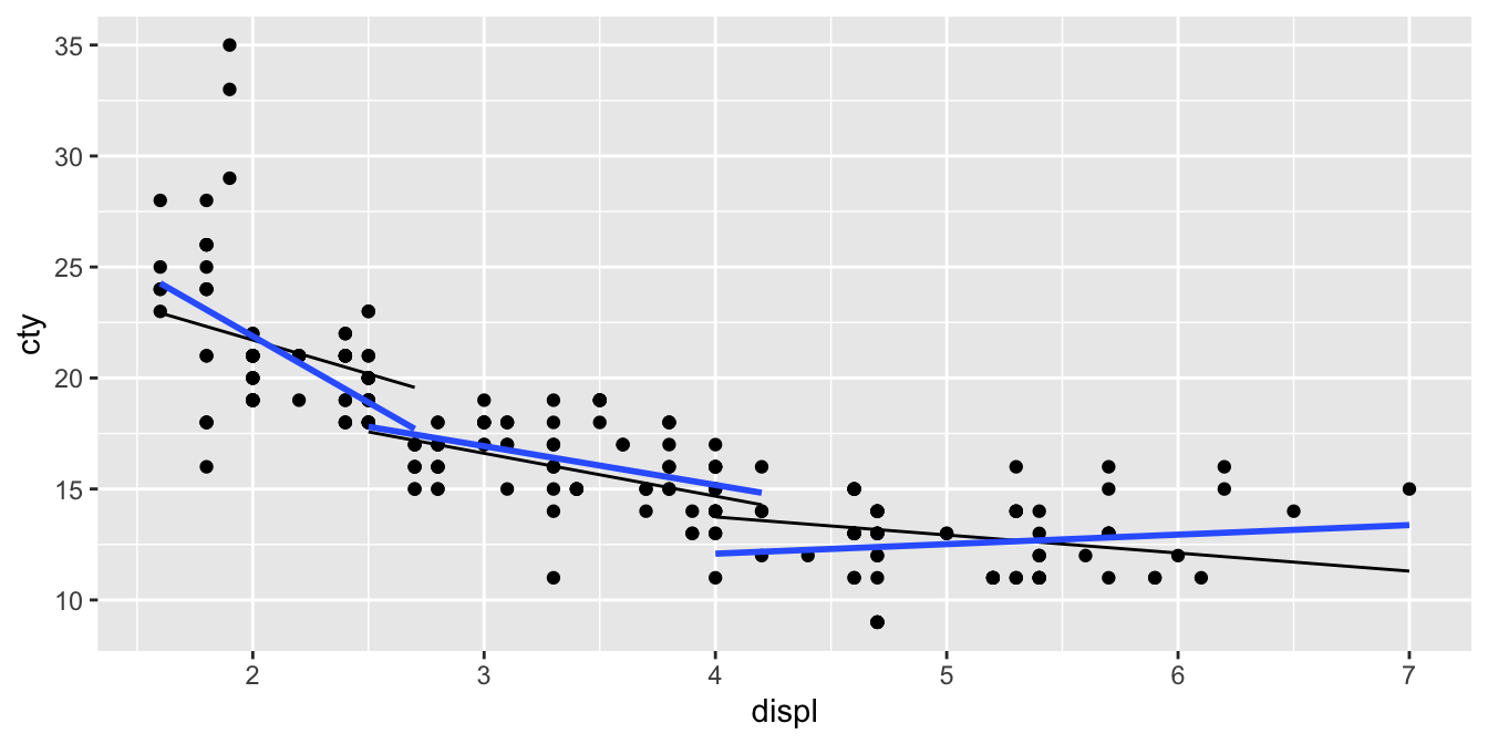 \[\begin{aligned} \widehat{\texttt{cty}} &= 0.6 -5.285 \times \texttt{displ} -2.704 \times 3 + 0.559 \times \texttt{displ} \times 3 \nonumber\\ \widehat{\texttt{cty}} &= -7.512 -3.608 \times \texttt{displ}\nonumber\end{aligned}\]